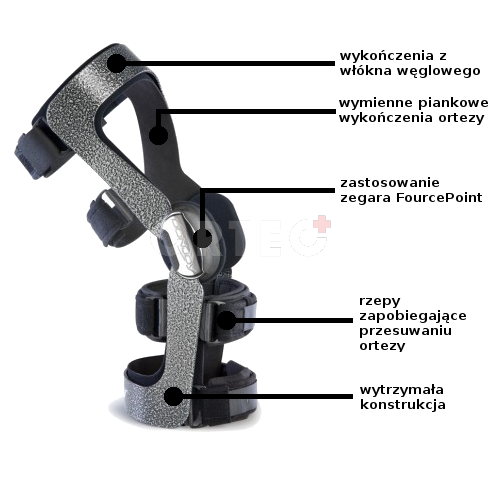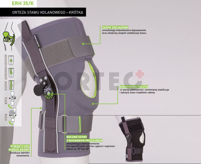Do jej głównych zalet można zaliczyć zdolność dopasowania elastycznych membran do stawu kolanowego, jak i kompresja, którą możemy zastosować poprze założenie, dołączonej do ortezy, opaski. Zwiększa to kontrolę neuromięśniową podczas zgięcia i wyprostu. Jest to produkt uniwersalny, zarówno na lewą i prawą nogę. Rozmiar dobieramy mierząc obwód uda na wysokości 15 cm powyżej środka rzepki.